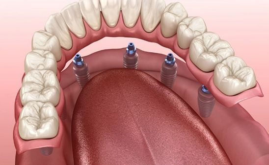 • 以固定於 4–6 支植牙的金屬支撐條連接